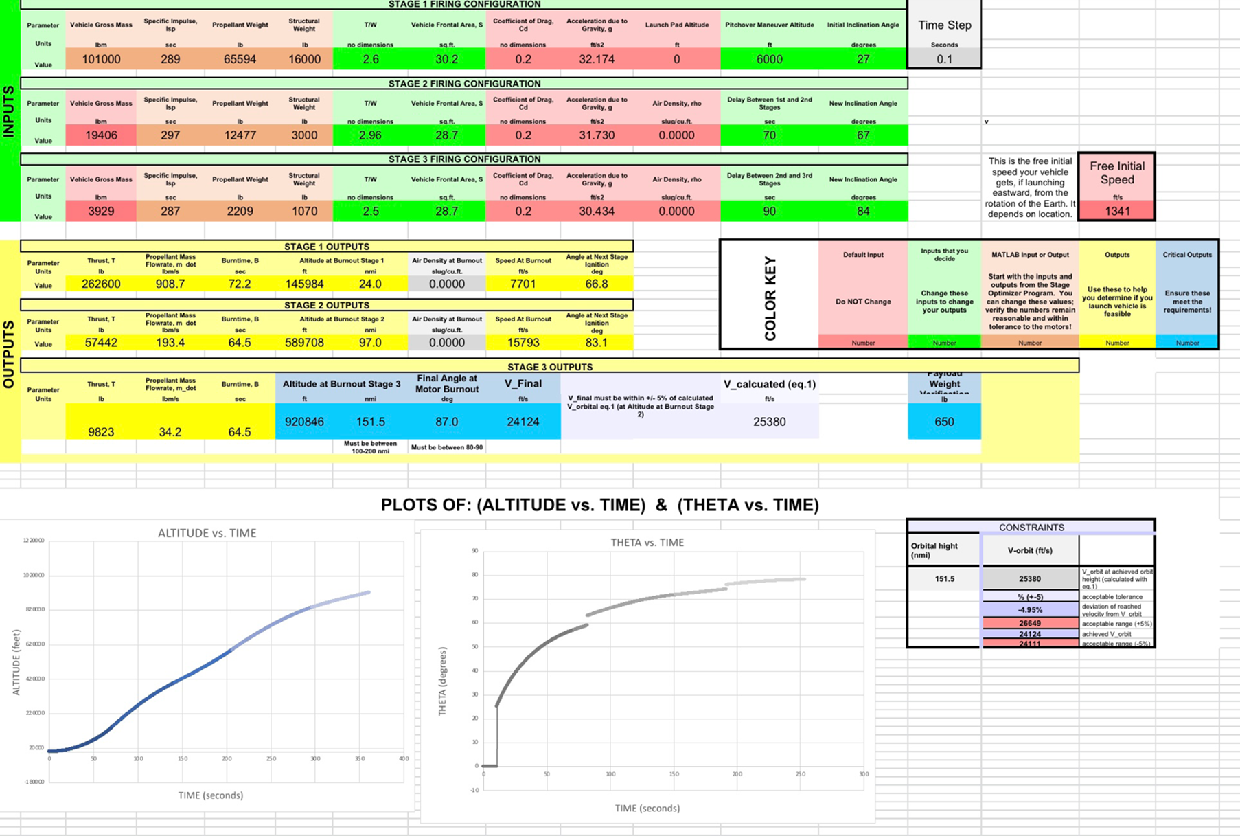 MGC-A1 is a three-stage, solid-propellant launch vehicle concept built to put a ~650 lb payload into Low Earth Orbit (~150 nmi class). The vehicle is sized around a compact payload stack and fairing, then optimized stage-by-stage to close mass, thrust, and trajectory requirements while keeping the architecture simple and manufacturable. The baseline configuration uses a stacked solid-motor approach with dedicated interstages, bulkheads, and a streamlined nosecone/fairing system to protect the payload through ascent and support clean separations. The project combined CAD-based packaging with performance modeling to validate the full mission profile. A trajectory model generated altitude and flight-path trends through burnout, and the staging/propellant masses were iterated to meet orbital energy targets with minimal margin waste. A preliminary cost model rolled up structure, motors, and integration to estimate a total vehicle cost of ~$14.2M, corresponding to about ~$21.8k per pound of payload, providing an early look at economic competitiveness for small-payload LEO missions.